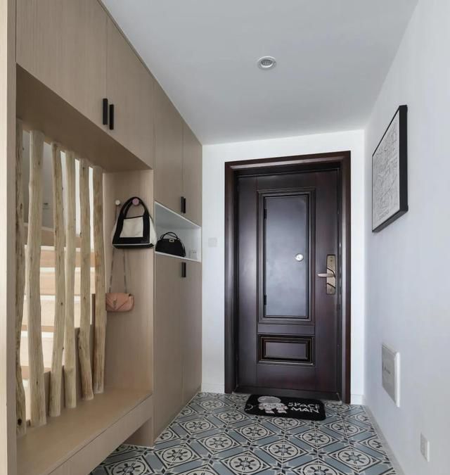 楼梯本身是从进门的右边直接上,但是装修的时候,直接做出来了一组玄关柜,楼梯从入户对面的玄关口上,中间保持采光和通透的明亮感,装的是镂空的木制隔断卡座,清新自然,而且卡座底下留出了空间,可以放置拖鞋等等,特别给力啦。