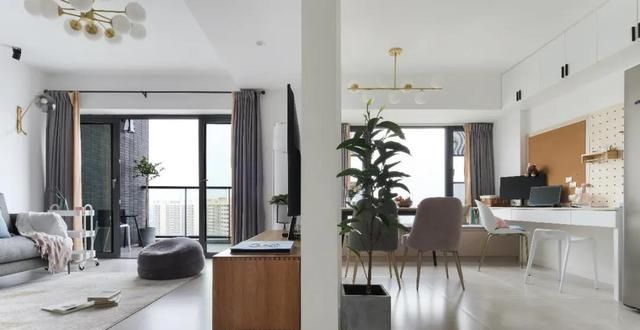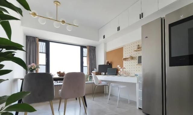 书桌和餐厅区做成一体式,还是挺讶异的吧?不过做成开放式也很方便,墙面装的是洞洞板,收纳一些书本杂物也很方便。