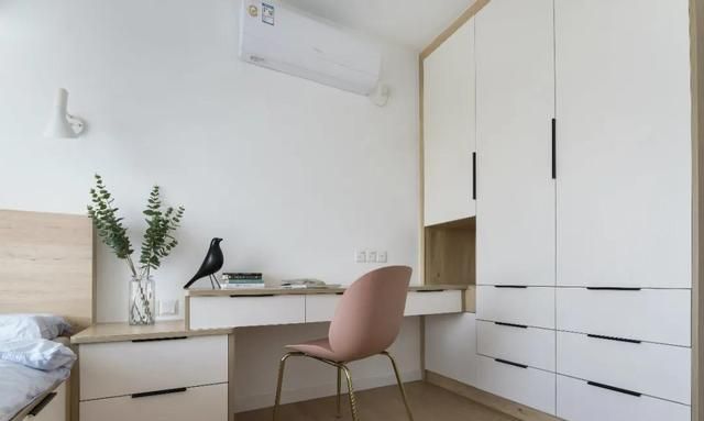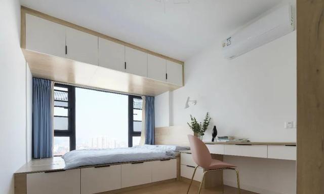 次卧则是以收纳为主的空间,是整体的榻榻米组合床,窗户上面都装了一整排的吊柜,书桌书柜比较全,这样当做一个孩子的成长空间就很好。