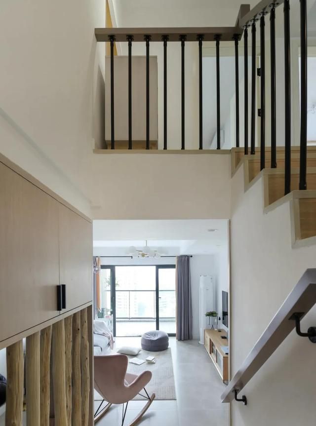 站在楼梯上看楼下的空间,转角的楼梯和直线楼梯相比要有空间感,相比较楼层的层高都要看着高起来。