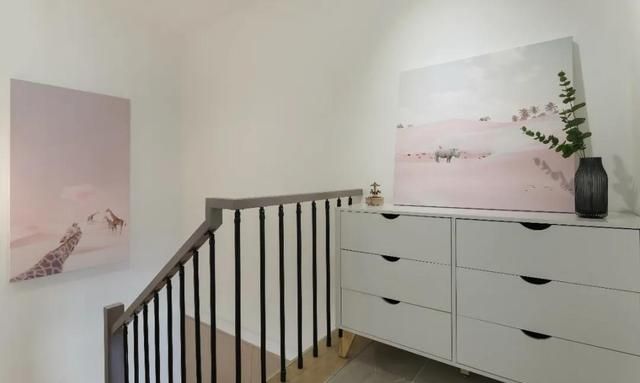 楼梯口用一幅幅装饰画做过渡,楼上的楼梯间摆放一组斗柜,平常也能做收纳。