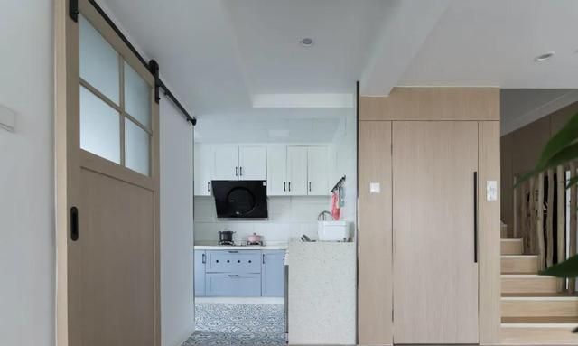 书房也差不多是个开放式的格局,转角的整体橱柜是撞色的,但是也都是比较温柔的浅色调,蓝色的地柜和白色的吊柜,漂亮是漂亮,也希望能耐脏吧。