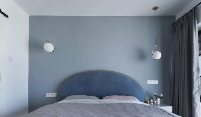主卧的背景墙刷成蓝灰色,比较浅淡,搭配同色系的家纺窗帘布艺,整体特别温和舒适。