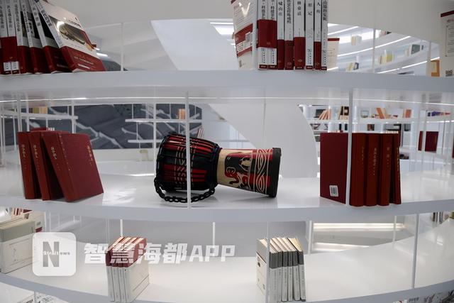 其最具特色的是中央的球形展架,这里陈列着五颜六色的图书和文创产品。图书以介绍中国传统文化内容为主。文创产品则覆盖了朱紫坊内的各种商户,包括乐器、脱胎漆器、软木雕、手工皮具等等。