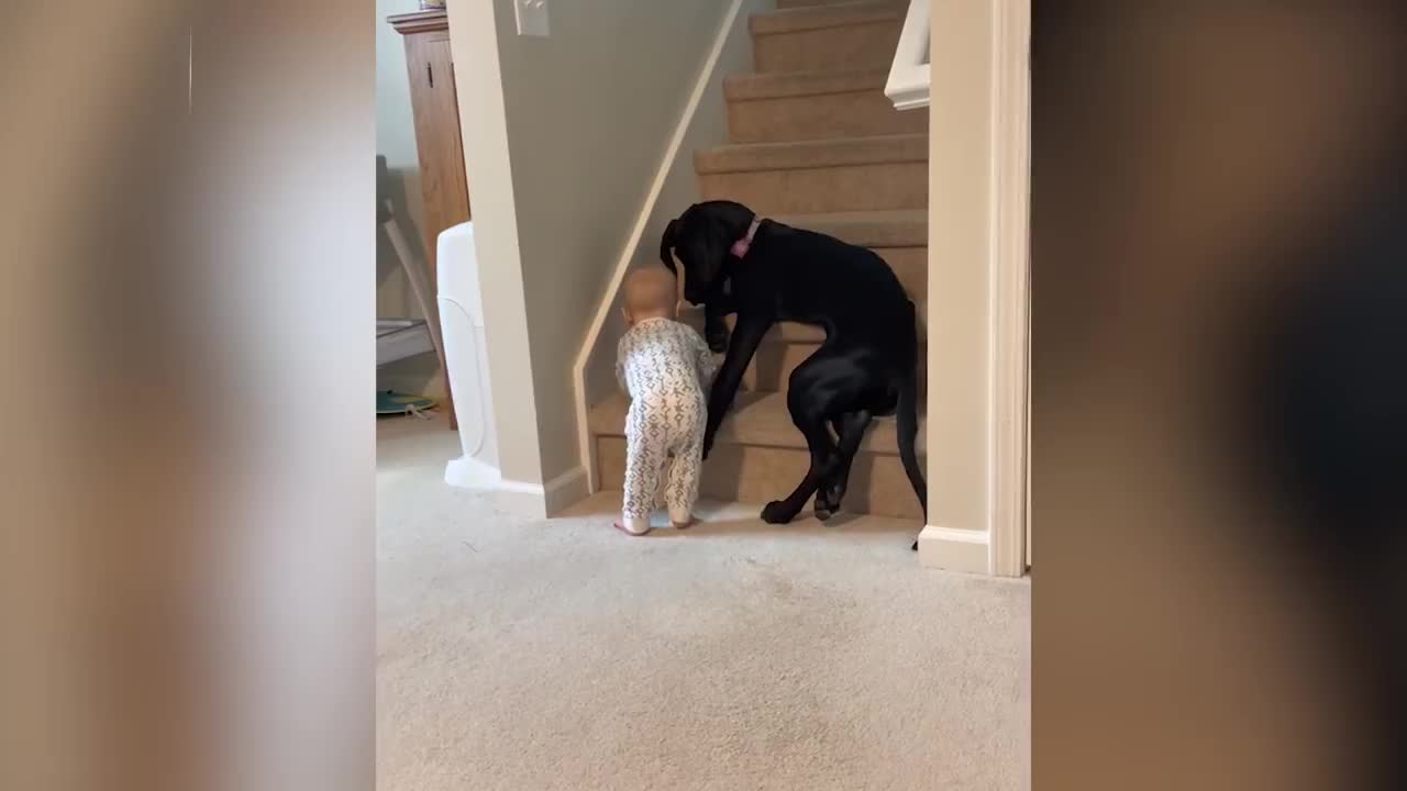 操碎了心!小宝贝一个劲想爬楼梯,狗狗在一旁虽然无奈但暖心护着